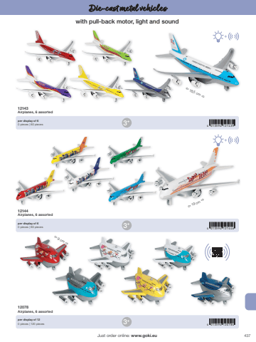 4374 013594 1214394 013594 1214464 013594 1207843+3+3+%u00ef 9 cm %u00f0%u00ef 18,5 cm %u00f0%u00ef 19 cm %u00f0Just order online: www.goki.euDie-cast metal vehicles12143Airplanes, 6 assorted12144Airplanes, 6 assorted12078Airplanes, 6 assortedper display of 60 pieces | 60 piecesper display of 60 pieces | 60 piecesper display of 120 pieces | 120 pieceswith pull-back motor, light and sound