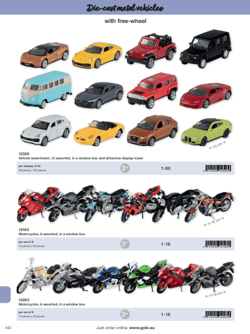 4424 013594 1226344 013594 1218354 013594 1232663+3+3+%u00ef 7,5 cm %u00f0%u00ef 11-12 cm %u00f0%u00ef 11-13 cm %u00f01 : 601 : 181 : 18Just order online: www.goki.euDie-cast metal vehicles12263Motorcycles, 6 assorted, in a window box12183Motorcycles, 6 assorted, in a window box12326Vehicle assortment, 12 assorted, in a window box and attractive display towerper set of 612 pieces | 48 piecesper set of 612 pieces | 48 piecesper display of 2496 pieces | 192 pieceswith free-wheel