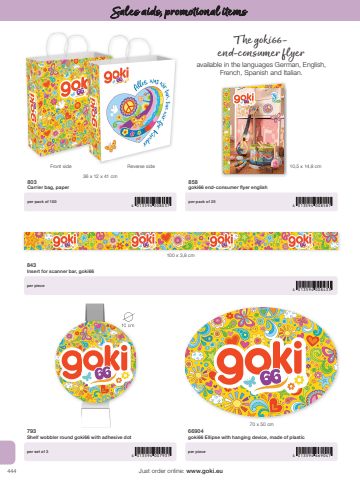 44436 x 12 x 41 cm4 013594 0080374 013594 008433100 x 3,8 cm10,5 x 14,8 cm4 013594 007931 4 013594 66904710 cm70 x 50 cm3Come molte altre aziende, goki ha sviluppato la propria responsabilit%u00e0 socio-ecologica ispirandosi alla %u201ccultura hippie%u201d.Rivitalizzare il grande obiettivoCreare una cultura della comunit%u00e0 e della solidariet%u00e0 basata sul rispetto reciproco, sulla comprensione e sulla cooperazione.%u201eTutto chi%u00f2 che facciamo,lo facciamo per i bambimi%u201c.Se vuoi saperne di pi%u00f9 su %u201cgoki66%u201d, leggi la storia molto personale del fondatore della nostra azienda. %u00c8 lui che ha avuto l%u2019idea di questa serie...3Come molte altre aziende, goki ha sviluppato la propria responsabilit%u00e0 socio-ecologica ispirandosi alla %u201ccultura hippie%u201d.Rivitalizzare il grande obiettivoCreare una cultura della comunit%u00e0 e della solidariet%u00e0 basata sul rispetto reciproco, sulla comprensione e sulla cooperazione.%u201eTutto chi%u00f2 che facciamo,lo facciamo per i bambimi%u201c.facciamo,Se vuoi saperne di pi%u00f9 su %u201cgoki66%u201d, leggi la storia molto personale del fondatore della nostra azienda. %u00c8 lui che ha avuto l%u2019idea di questa serie...10 cmJust order online: www.goki.euSales aids, promotional items803Carrier bag, paper858goki66 end-consumer fl yer englishper pack of 100 per pack of 25843Insert for scanner bar, goki66per piece793Shelf wobbler round goki66 with adhesive dot66904goki66 Ellipse with hanging device, made of plasticper set of 3 per pieceFront side Reverse sideThe goki66- end-consumer flyer available in the languages German, English, French, Spanish and Italian.4 013594 008587