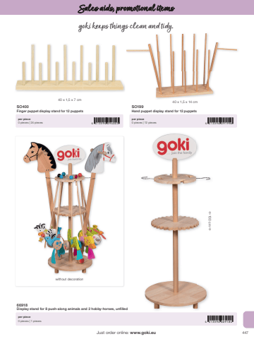 4474 013594 2940034 013594 6691844 013594 29199640 x 1,5 x 7 cm 40 x 1,5 x 14 cm%u00ef 100 cm %u00f0Just order online: www.goki.euSales aids, promotional itemsSO400Finger puppet display stand for 12 puppets66918Display stand for 8 push-along animals and 2 hobby-horses, unfilledSO199Hand puppet display stand for 12 puppetsper piece0 pieces | 24 piecesper piece0 pieces | 1 piecesper piece0 pieces | 12 piecesgoki kee ps things clean and tidy.without decoration