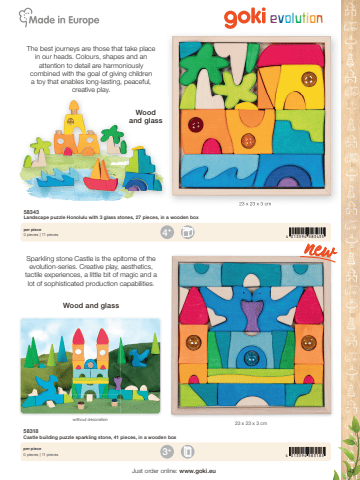 43evolution23 x 23 x 3 cm23 x 23 x 3 cm4 013594 5831834 013594 5834353+4+Just order online: www.goki.eu58318Castle building puzzle sparkling stone, 41 pieces, in a wooden box58343Landscape puzzle Honolulu with 3 glass stones, 27 pieces, in a wooden boxper piece0 pieces | 11 piecesper piece0 pieces | 11 piecesWood and glassWood and glassThe best journeys are those that take place in our heads. Colours, shapes and an attention to detail are harmoniously combined with the goal of giving children a toy that enables long-lasting, peaceful, creative play.Sparkling stone Castle is the epitome of the evolution-series. Creative play, aesthetics, tactile experiences, a little bit of magic and a lot of sophisticated production capabilities.without decoration