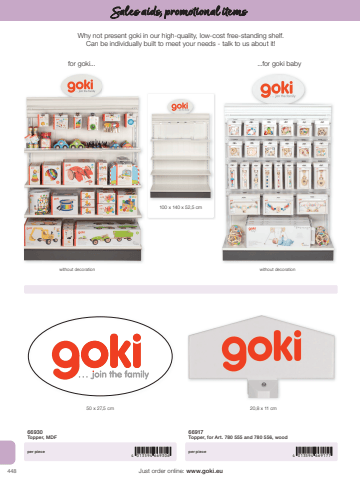 4484 013594 669306 4 013594 669177100 x 140 x 52,5 cm50 x 27,5 cm 20,8 x 11 cmJust order online: www.goki.euSales aids, promotional items66917Topper, for Art. 780 555 and 780 556, wood66930Topper, MDFper piece per pieceWhy not present goki in our high-quality, low-cost free-standing shelf. Can be individually built to meet your needs - talk to us about it!for goki... ...for goki babywithout decoration without decoration