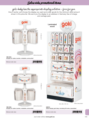 4494 011534 805562 4 013594 6691394 011534 805555%u00ef 86 cm %u00f0%u00ef 50 cm %u00f058 x 38 x 161 cmJust order online: www.goki.euSales aids, promotional items780 556Display for sales counter, rotatable, unmounted66913Sales display goki baby, including 20 hooks, assembled780 555Display for sales counter, rotatable, unmountedMinimum order value Minimum order valueMinimum order valuegoki-baby has the appropriate display solution - free for you. How it works: you choose the display you want and order goods for the minimum stock amount shown in the price list. We send you the display to an address in Germany free of charge and carriage paid.without decorationwithout decorationwithout decorationLaminated wood