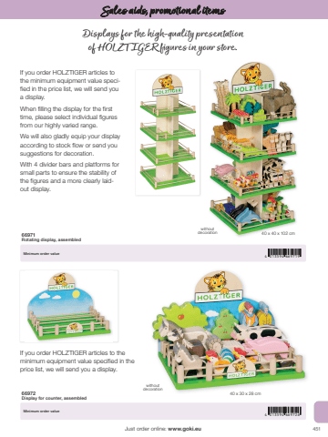 4514 013594 6697264 013594 66971940 x 40 x 102 cm40 x 30 x 28 cmJust order online: www.goki.euSales aids, promotional items66972Display for counter, assembled66971Rotating display, assembledMinimum order valueMinimum order valueIf you order HOLZTIGER articles to the minimum equipment value specified in the price list, we will send you a display.When filling the display for the first time, please select individual figures from our highly varied range. We will also gladly equip your display according to stock flow or send you suggestions for decoration.With 4%u00a0divider bars and platforms for small parts to ensure the stability of the figures and a more clearly laidout display.Displays for the high-quality presentation of HOLZTIGER fi gures in your store.without decorationIf you order HOLZTIGER articles to the minimum equipment value specified in the price list, we will send you a display.without decoration