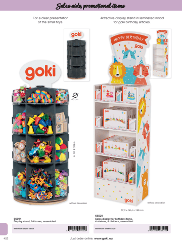 4524 013594 669146 4 013594 669214%u00ef 100,4 cm %u00f040 cm57,2 x 36,4 x 199 cmJust order online: www.goki.euSales aids, promotional items66914Display stand, 24 boxes, assembled66921Sales display for birthday items, 4 shelves, 8 dividers, assembledMinimum order value Minimum order valuewithout decoration without decorationFor a clear presentation of the small toys.Attractive display stand in laminated wood for goki birthday articles.