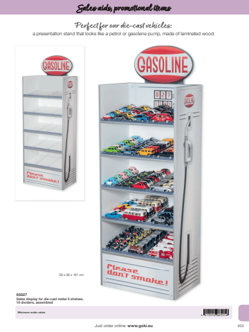 4534 013594 66927658 x 38 x 161 cmJust order online: www.goki.euSales aids, promotional items66927Sales display for die-cast metal 5 shelves, 10 dividers, assembledMinimum order valuePerfect for our die-cast vehicles: a presentation stand that looks like a petrol or gasolene pump, made of laminated wood.