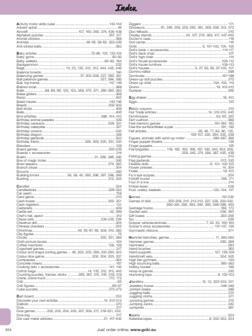 454 Just order online: www.goki.euIndexActivity motor skills cube ...................................................... 143-144Advent spiral ..................................................................................46Aircraft ...................................................157, 160, 260, 374, 436-438Alphabet puzzles ..................................................................267, 317Animal clickers .............................................................................388Animals ..........................................................48-56, 58-62, 323-326Anti-stress balls............................................................................383Baby articles .......................................................72-96, 122, 123-124Baby gyms............................................................................... 90-93Baby walkers.....................................................................90-93, 184Backgammon ..............................................................................222Bags ......................................... 14, 23, 135, 312, 313, 444, 445, 446Balance boards............................................................................ 190Balancing games .....................................37, 205-208, 227, 290, 391Ball patience games..................................................... 227, 394, 395Ball, top tracks ...................................................................... 147, 148Balloon boat.................................................................................368Balls .....................88, 89, 96, 122, 123, 369, 370, 371, 380-382, 383Balsa gliders ................................................................................368Banjo ...........................................................................................405Bead mazes.......................................................................... 143-146Beads ...................................................................................302-303Bell sticks.....................................................................................409Bells .............................................................................................406Bird whistles..................................................................388, 414, 415Birthday animal parades ..............................................................329Birthday caravans ................................................................ 329, 331Birthday caterpillar ....................................................................... 327Birthday crowns...........................................................................335Birthday dragon ........................................................................... 328Birthday garlands.........................................................................333Birthday trains.............................................. 328, 329, 330, 331, 332Blenders ...................................................................................... 139Board games ........................................................................220-226Boards + accessories .................................................................. 314Boats ..................................................................... 31, 368, 386, 392Box of magic tricks ......................................................................392Brain teasers........................................................................ 274, 395Branch slices ..............................................................................304Brooms ........................................................................................362Building bricks ........................... 38, 39, 40, 295, 296, 297, 298, 299 Bunting ................................................................................ 312, 335Candles .......................................................................................334Candlesticks .........................................................................329-333Car wash...................................................................................... 158Card game................................................................................... 210Cash boxes.......................................................................... 350, 351Cash registers.............................................................................. 131Castanets.....................................................................................409Castle set...............................................................................43, 299Chef%u2018s hat, apron ......................................................................... 312Chess sets ....................................................................224-225, 226Chestnut drill................................................................................304Chinese checkers ........................................................................222Christmas.............................................. 46, 65-67, 69, 309, 310, 385Clip figures ..................................................................................... 75Clocks ......................................................................... 320, 321, 389Cloth picture books...................................................................... 124Coffee machines.................................................................. 138, 139Cogwheel games......................................................................... 317Colour and shape sorting games.... 46, 202, 203, 290, 291-294, 322Colour dice game................................................. 202, 204, 205, 207Compasses..................................................................................364Concrete mixers........................................................................... 167Cooking sets + accessories...........................