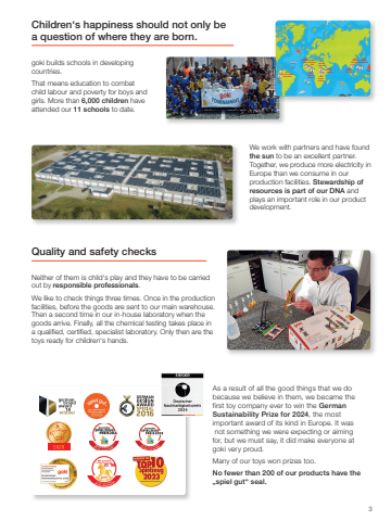 32001Phu LeVietnam2007NegrosPhilippinen2009NegrosPhilippinen2002Villa San Javier Kolumbien2002Ja%u00e9nPeru2003BerdossouMali2005BerdossouMali2020KokrobiteGhana2011BupotoUganda2012BupotoUganda2013BupotoUgandaWe work with partners and have found the sun to be an excellent partner. Together, we produce more electricity in Europe than we consume in our production facilities. Stewardship of resources is part of our DNA and plays an important role in our product development.Children%u2018s happiness should not only be a question of where they are born.goki builds schools in developing countries.That means education to combat child labour and poverty for boys and girls. More than 6,000 children have attended our 11 schools to date.Quality and safety checksNeither of them is child%u2018s play and they have to be carried out by responsible professionals.We like to check things three times. Once in the production facilities, before the goods are sent to our main warehouse. Then a second time in our in-house laboratory when the goods arrive. Finally, all the chemical testing takes place in a qualified, certified, specialist laboratory. Only then are the toys ready for children%u2018s hands.As a result of all the good things that we do because we believe in them, we became the first toy company ever to win the German Sustainability Prize for 2024, the most important award of its kind in Europe. It was not something we were expecting or aiming for, but we must say, it did make everyone at goki very proud.Many of our toys won prizes too.No fewer than 200 of our products have the %u201espiel gut%u201c seal.