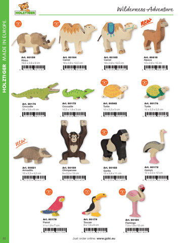 50HOLZTIGER MADE IN EUROPE.4 0 1 3 5 9 4 8 0 1 5 8 44 0 1 3 5 9 4 8 0 17444 0 1 3 5 9 4 8 0 172 04 0 1 3 5 9 4 8 0 1 7 5 1 4 0 1 3 5 9 4 805 4 5 24 0 1 3 5 9 4 806 2 1 3 4 0 1 3 5 9 4 8 0 1 6 9 04 0 1 3 5 9 4 8 0 1 7 8 24 0 1 3 5 9 4 8 0 1 6834 0 1 3 5 9 4 8 0 17994 0 1 3 5 9 4 8 0 1 7 6 84 0 1 3 5 9 4 8 0 1 6 4 5 4 0 1 3 5 9 4 8 0 1 6 5 2 4 0 1 3 5 9 4 806 1 8 34 0 1 3 5 9 4 8 0 1 805Just order online: www.goki.euWildernefi AdventureArt. 80172 Ostrich12 x 2,3 x 12 cmArt. 80178 Parrot11 x 1,9 x 7 cmArt. 80179Toucan 9 x 1,9 x 8 cmArt. 80180 Flamingo7,5 x 1,9 x 12 cmArt. 80174Crocodile 26 x 2,8 x 8 cmArt. 80175 Crocodile10,5 x 1,9 x 3 cmArt. 80176Turtle 10 x 2,3 x 5,5 cmArt. 80545Turtle 10 x 2,3 x 5 cmArt. 80168 Gorilla12 x 2,8 x 11 cmArt. 80169 Chimpanzee9 x 2,3 x 13 cmArt. 80621 Armadillo12 x 2,3 x 4,2 cmArt. 80158Rhino 19,5 x 2,8 x 9 cmArt. 80165 Camel18 x 2,8 x 13,5 cmArt. 80618 Alpaca13 x 2,8 x 15 cmArt. 80164 Camel18 x 2,8 x 13,5 cm