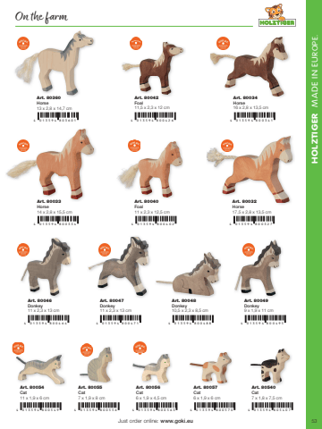 53HOLZTIGER MADE IN EUROPE.4 0 1 3 5 9 4 80360 14 0 1 3 5 9 4 80033 44 0 1 3 5 9 4 800 4 6 44 0 1 3 5 9 4 8005 4 94 0 1 3 5 9 4 800 4714 0 1 3 5 9 4 8005564 0 1 3 5 9 4 800 4 8 84 0 1 3 5 9 4 8005634 0 1 3 5 9 4 800 4 9 54 0 1 3 5 9 4 8005 7 04 0 1 3 5 9 4 800 4 0 2 4 0 1 3 5 9 4 8003 2 74 0 1 3 5 9 4 800 4 2 6 4 0 1 3 5 9 4 8003 4 14 0 1 3 5 9 4 805 4 0 7Just order online: www.goki.euOn the farmArt. 80032Horse17,5 x 2,8 x 13,5 cmArt. 80033 Horse14 x 2,8 x 15,5 cmArt. 80040 Foal11 x 2,3 x 12,5 cmArt. 80042Foal 11,5 x 2,3 x 12 cmArt. 80034 Horse16 x 2,8 x 13,5 cmArt. 80360Horse13 x 2,8 x 14,7 cmArt. 80046Donkey 11 x 2,3 x 13 cmArt. 80047 Donkey 11 x 2,3 x 13 cmArt. 80048 Donkey 10,5 x 2,3 x 8,5 cmArt. 80049 Donkey 9 x 1,9 x 11 cmArt. 80057Cat6 x 1,9 x 6 cmArt. 80056 Cat6 x 1,9 x 4,5 cmArt. 80055Cat7 x 1,9 x 8 cmArt. 80054 Cat11 x 1,9 x 6 cmArt. 80540 Cat7 x 1,8 x 7,5 cm