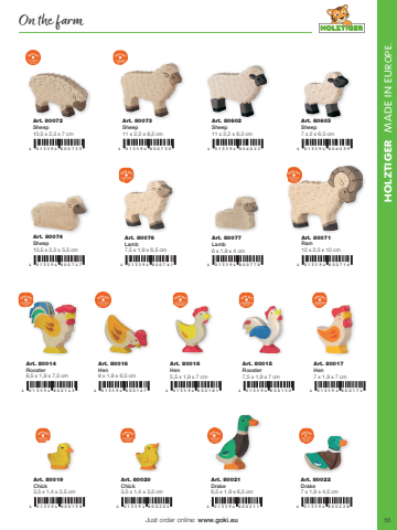 55HOLZTIGER MADE IN EUROPE.4 0 1 3 5 9 4 800 7 6 1 4 0 1 3 5 9 4 800 7 1 64 0 1 3 5 9 4 800 1 9 84 0 1 3 5 9 4 800 1 4 3 4 0 1 3 5 9 4 800 1 6 7 4 0 1 3 5 9 4 800 1 8 1 4 0 1 3 5 9 4 800 1 5 0 4 0 1 3 5 9 4 800 1744 0 1 3 5 9 4 800 7 2 34 0 1 3 5 9 4 800 7 7 84 0 1 3 5 9 4 800 2 0 44 0 1 3 5 9 4 800 7 3 0 4 0 1 3 5 9 4 8060 2 2 4 0 1 3 5 9 4 80603 94 0 1 3 5 9 4 800 2114 0 1 3 5 9 4 800 7474 0 1 3 5 9 4 800 2 2 8Just order online: www.goki.euArt. 80071 Ram12 x 2,3 x 10 cmArt. 80072Sheep 10,5 x 2,3 x 7 cmArt. 80073 Sheep 11 x 2,3 x 8,5 cmArt. 80602 Sheep 11 x 2,2 x 8,3 cmArt. 80603 Sheep 7 x 2 x 6,5 cmArt. 80074 Sheep 10,5 x 2,3 x 5,5 cmArt. 80076 Lamb7,5 x 1,9 x 6,5 cmArt. 80014 Rooster8,5 x 1,9 x 7,5 cmArt. 80016 Hen8 x 1,9 x 6,5 cmArt. 80077Lamb6 x 1,9 x 4 cmArt. 80018Hen5,5 x 1,9 x 7 cmArt. 80017Hen7 x 1,9 x 7 cmArt. 80015Rooster 7,5 x 1,9 x 7 cmArt. 80019 Chick3,5 x 1,4 x 3,5 cmArt. 80020 Chick3,5 x 1,4 x 3,5 cmArt. 80021Drake 6,5 x 1,9 x 6,5 cmArt. 80022Drake 7 x 1,9 x 4,5 cmOn the farm