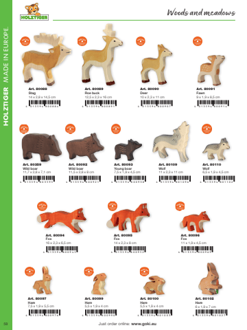 58HOLZTIGER MADE IN EUROPE.4 0 1 3 5 9 4 80088 44 0 1 3 5 9 4 800 9 7 64 0 1 3 5 9 4 8035 9 54 0 1 3 5 9 4 800 9 4 5 4 0 1 3 5 9 4 800 9 5 2 4 0 1 3 5 9 4 800 9 6 94 0 1 3 5 9 4 800 921 4 0 1 3 5 9 4 800 9 3 8 4 0 1 3 5 9 4 8 0 1 0 9 6 4 0 1 3 5 9 4 8 0 1 1 0 24 0 1 3 5 9 4 8008 9 14 0 1 3 5 9 4 800 9 9 04 0 1 3 5 9 4 800 9 0 74 0 1 3 5 9 4 8 0 1 0034 0 1 3 5 9 4 800 9144 0 1 3 5 9 4 8 0 1 0 2 7Just order online: www.goki.euArt. 80097 Hare7,5 x 1,9 x 5,5 cmArt. 80099Hare5,5 x 1,9 x 4 cmArt. 80100Hare5,5 x 1,9 x 4 cmArt. 80102 Hare6 x 1,9 x 7 cmArt. 80088Stag 14 x 2,8 x 14,5 cmArt. 80089 Roe buck12,5 x 2,3 x 16 cmArt. 80090 Deer10 x 2,3 x 11 cmArt. 80091 Fawn9 x 1,9 x 8,5 cmArt. 80110 Wolf6,5 x 1,9 x 4,5 cmArt. 80109 Wolf11 x 2,3 x 11 cmArt. 80093Young boar 7,5 x 1,9 x 4,5 cmArt. 80092Wild boar11,5 x 2,8 x 8 cmArt. 80359 Wild boar11,7 x 2,8 x 7,1 cmArt. 80094Fox 16 x 2,3 x 6,5 cmArt. 80095Fox 14 x 2,3 x 8 cmArt. 80096Fox 11 x 1,9 x 4,5 cmWff ds and meadows