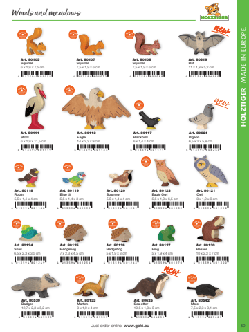 59HOLZTIGER MADE IN EUROPE.4 0 1 3 5 9 4 8 0 1 1 8 84 0 1 3 5 9 4 8 0 12494 0 1 3 5 9 4 8053 9 1 4 0 1 3 5 9 4 8 0 1 3 3 1 4 0 1 3 5 9 4 806 2 5 1 4 0 1 3 5 9 4 805 4214 0 1 3 5 9 4 8 0 1119 4 0 1 3 5 9 4 8 0 1 1 3 3 4 0 1 3 5 9 4 8 0 1171 4 0 1 3 5 9 4 806 2444 0 1 3 5 9 4 8 0 1 0584 0 1 3 5 9 4 8 0 119 54 0 1 3 5 9 4 8 0 1 2 5 64 0 1 3 5 9 4 8 0 1 0 7 24 0 1 3 5 9 4 8 0 1 2 0 14 0 1 3 5 9 4 8 0 1 2 6 34 0 1 3 5 9 4 8 0 1 2 3 24 0 1 3 5 9 4 8 0 127 04 0 1 3 5 9 4 8 0 1 0 8 9 4 0 1 3 5 9 4 806 1 9 04 0 1 3 5 9 4 8 0 121 84 0 1 3 5 9 4 8 0 1 300Just order online: www.goki.euArt. 80105Squirrel 6 x 1,9 x 7,5 cmArt. 80107Squirrel 7,5 x 1,9 x 6 cmArt. 80108Squirrel 7,5 x 1,9 x 6 cmArt. 80619Bat 11 x 1,8 x 5,2 cmArt. 80111Stork 6 x 1,9 x 11,5 cmArt. 80113Eagle 14 x 2,3 x 9 cmArt. 80117 Blackbird6 x 1,4 x 4 cmArt. 80624 Pigeon6,5 x 2 x 5,8 cmArt. 80119Blue tit 5,5 x 1,4 x 3 cmArt. 80118 Robin5,5 x 1,4 x 4 cmArt. 80120 Sparrow5,5 x 1,4 x 4 cmArt. 80123 Eagle Owl5,5 x 1,9 x 6,5 cmArt. 80121 Owl8 x 1,9 x 8 cmArt. 80127Frog 5 x 1,9 x 4 cmArt. 80126Hedgehog 5 x 1,9 x 3 cmArt. 80125Hedgehog 7 x 2,3 x 4,5 cmArt. 80124Snail 6,5 x 2,3 x 3,5 cmArt. 80130Beaver 10 x 2,3 x 7 cmArt. 80539Badger 12,7 x 2,3 x 5,2 cmArt. 80542 Mole 7,5 x 2,3 x 3,1 cmArt. 80625Sea otter 10,5 x 1,8 x 5 cmArt. 80133Marten 8 x 1,9 x 4 cmWff ds and meadows