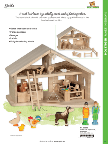 63HOLZTIGER MADE IN EUROPE.4 0 1 3 5 9 4 806 1 3 8Just order online: www.goki.euStableA real heirlff m toy: solidly made and of lasting value.The barn is built of solid, premium quality wood. Made by goki in Europe in the best artisanal tradition.%u2022 Gates that open and close%u2022 Fence sections%u2022 Manger%u2022 Ladder%u2022 Fully-functioning winchwithout decorationArt. 80613 Stable with rope winch,assembled56,5 x 38 x 38,5 cm