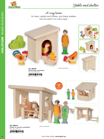 64HOLZTIGER MADE IN EUROPE.4 013594 8061524 013594 806169Just order online: www.goki.euStable and shelterArt. 80615 Small stable, assembled16 x 15 x 18,5 cmArt. 80616 Shelter for animals, assembled26 x 26 x 22,5 cmA cosy homefor hens, rabbits and horses, and these shelters can be used in so many ways.without decorationwithout decoration
