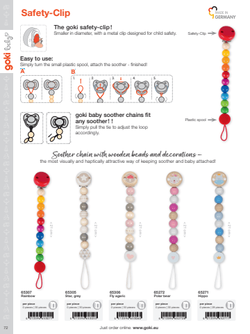 72AB1. 2. 3. 4. 5.1. 2.AB1. 2. 3. 4. 5.1. 2.Safety-Clip1. 2. 3. 4. 5.1. 2. 3. 4. 5.< 21 cm > < 21 cm > < 21 cm > < 21 cm > < 21 cm >4 013594 653077 4 013594 653053 4 013594 653060 4 013594 652728 4 013594 652711Just order online: www.goki.euper piece0 pieces | 30 piecesper piece0 pieces | 30 piecesper piece0 pieces | 30 piecesper piece0 pieces | 30 piecesper piece0 pieces | 28 piecesThe goki safety-clip !Smaller in diameter, with a metal clip designed for child safety.Sffl ther chain with wffl den beads and decorations %u2013 the most visually and haptically attractive way of keeping soother and baby attached!Easy to use:Simply turn the small plastic spool, attach the soother - fi nished!Plastic spoolSafety-Clipgoki baby soother chains fi t any soother ! ! Simply pull the tie to adjust the loop accordingly.65307Rainbow65305Star, grey65306Fly agaric65272Polar bear65271Hippo