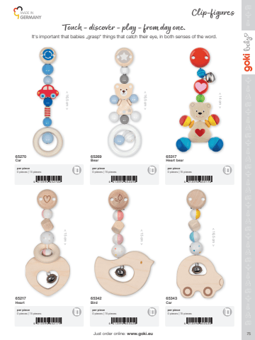 75< 14 cm > < 16,5 cm > < 15 cm > < 16,5 cm > < 15 cm > < 16,5 cm >4 013594 6521794 013594 6527044 013594 6534284 013594 6526984 013594 6534354 013594 653176Just order online: www.goki.euper piece0 pieces | 15 piecesper piece0 pieces | 15 piecesper piece0 pieces | 15 piecesper piece0 pieces | 15 piecesper piece0 pieces | 15 piecesper piece0 pieces | 15 piecesTouch - discffi er - play - from day one. It%u2018s important that babies %u201egrasp%u201c things that catch their eye, in both senses of the word.65217Heart65270Car65342Bird65269Bear65343Car65317Heart bearClip-figures