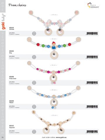 784 013594 6526674 013594 6526504 013594 6526434 013594 6523464 013594 653121< 40 cm >< 40 cm >< 40 cm >< 40 cm >< 40 cm >Just order online: www.goki.eu65266Polar bear65265Hippoper piece0 pieces | 10 piecesper piece0 pieces | 10 pieces65264Boy65234Horsesper piece0 pieces | 10 piecesper piece0 pieces | 10 pieces65312Squirrelper piece0 pieces | 10 piecesPram chains