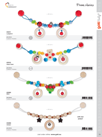 794 013594 6531384 013594 6526294 013594 6531144 013594 6528964 013594< 40 cm >< 40 cm >4 013594< 40 cm >4 013594< 40 cm >Just order online: www.goki.eu65313Heart bear65262Birdper piece0 pieces | 10 piecesper piece0 pieces | 9 pieces65311Ladybirdper piece0 pieces | 10 pieces65289Amberper piece0 pieces | 10 piecesPram chainswith realamber!