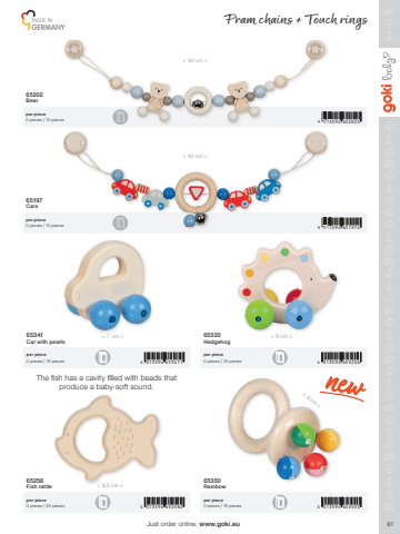 814 013594 6520254 013594 6519744 013594 6525824 013594 6534114 013594 6535034 013594 6532064 013594< 40 cm >4 013594< 40 cm >< 7 cm > < 9 cm >< 9,3 cm >< 9 cm >Just order online: www.goki.eu65202Bear65197Carsper piece0 pieces | 10 piecesper piece0 pieces | 10 pieces65258Fish rattle65341Car with pearls65350Rainbow65320Hedgehogper piece0 pieces | 30 piecesper piece0 pieces | 16 piecesper piece0 pieces | 18 piecesper piece0 pieces | 16 piecesThe fi sh has a cavity fi lled with beads that produce a baby-soft sound.Pram chains + Touch rings