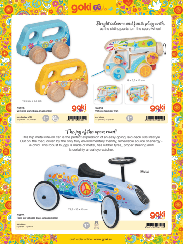74 013594 558297 4 013594 5483974 013594 5377041+ 1+10 x 5,5 x 6,5 cm18 x 5,5 x 12 cm4 01359473,5 x 35 x 40 cm1+ max.25 kgJust order online: www.goki.eu55829Vehicles Van Ibiza, 2 assorted54839Vehicle Camper Van53770Ride-on vehicle blue, unassembledper display of 832 pieces | 64 piecesper piece12 pieces | 24 piecesper piece0 pieces | 1 pieceBright colours and fun to play with,as the sliding parts turn the spare wheel.The joy of the open road! This hip metal ride-on car is the perfect expression of an easy-going, laid-back 60s lifestyle. Out on the road, driven by the only truly environmentally friendly, renewable source of energy - a child. This robust buggy is made of metal, has rubber tyres, proper steering and is certainly a real eye-catcher.Metal