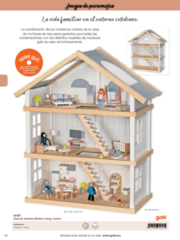 983 4 013594 514910+65 x 35 x 87,5 cmSimplemente solicite en la web: www.goki.euJuegos de personajes51491Casa de mu%u00f1ecas Modern Living, 3 pisoscada pieza0 piezas | 1 piezasin decoraci%u00f3nLa combinaci%u00f3n de los modernos colores de la casa de mu%u00f1ecas de tres pisos garantiza que todas las combinaciones con los distintos muebles de mu%u00f1ecas goki se vean armoniosamente.La vida familiar en el entorno cotidiano.