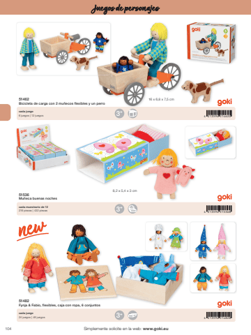1044 013594 5148284 013594 5153684 013594 5146203+3+3+16 x 6,8 x 7,5 cm8,2 x 5,4 x 3 cmSimplemente solicite en la web: www.goki.euJuegos de personajes51482Fynja & Fabio, flexibles, caja con ropa, 6 conjuntos51536Mu%u00f1eca buenas noches51462Bicicleta de carga con 2 mu%u00f1ecos flexibles y un perrocada juego24 juegos | 48 juegoscada muestrario de 12216 piezas | 432 piezascada juego6 juegos | 12 juegos
