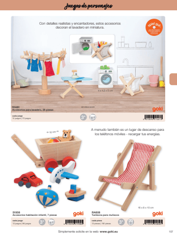 1073 4 013594 514613+3+ 3+4 013594 519380 4 013594 2580814 x 4,5 x 5 cm16 x 8 x 10 cm%u00ef 10 cm %u00f0Simplemente solicite en la web: www.goki.euJuegos de personajes51461Accesorios para lavadero, 29 piezascada juego12 juegos | 72 juegos51938Accesorios habitaci%u00f3n infantil, 7 piezasRA808Tumbona para mu%u00f1ecoscada juego12 juegos | 96 juegoscada pieza12 piezas | 192 piezassin decoraci%u00f3nCon detalles realistas y encantadores, estos accesorios decoran el lavadero en miniatura.A menudo tambi%u00e9n es un lugar de descanso para los tel%u00e9fonos m%u00f3viles - recargar tus energ%u00edas.