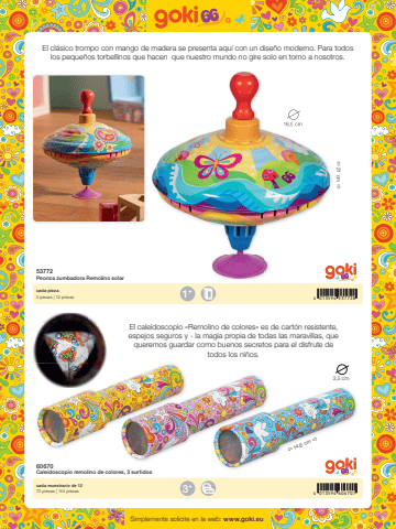 94 013594 5377284 013594 6067071+3+%u00ef 21 cm %u00f018,5 cm%u00ef 14,6 cm %u00f03,5 cmSimplemente solicite en la web: www.goki.eu53772Peonza zumbadora Remolino solar60670Caleidoscopio remolino de colores, 3 surtidoscada pieza0 piezas | 12 piezascada muestrario de 1272 piezas | 144 piezasEl cl%u00e1sico trompo con mango de madera se presenta aqu%u00ed con un dise%u00f1o moderno. Para todos los peque%u00f1os torbellinos que hacen que nuestro mundo no gire solo en torno a nosotros.El caleidoscopio %u00abRemolino de colores%u00bb es de cart%u00f3n resistente, espejos seguros y - la magia propia de todas las maravillas, que queremos guardar como buenos secretos para el disfrute de todos los ni%u00f1os.