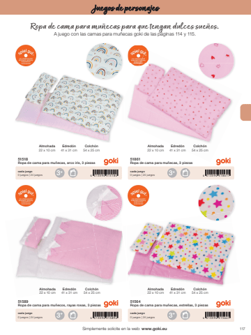 1173+3+3+3+4 013594 5158944 013594 5151844 013594 5156414 013594 518611Simplemente solicite en la web: www.goki.euJuegos de personajes51589Ropa de cama para mu%u00f1ecos, rayas rosas, 3 piezas51518Ropa de cama para mu%u00f1ecas, arco iris, 3 piezas51564Ropa de cama para mu%u00f1ecas, estrellas, 3 piezas51861Ropa de cama para mu%u00f1ecas, 3 piezascada juego0 juegos | 24 juegoscada juego0 juegos | 24 juegoscada juego0 juegos | 24 juegoscada juego0 juegos | 24 juegosAlmohada22 x 10 cmAlmohada22 x 10 cmAlmohada22 x 10 cmAlmohada22 x 10 cmEdred%u00f3n41 x 31 cmEdred%u00f3n41 x 31 cmEdred%u00f3n41 x 31 cmEdred%u00f3n41 x 31 cmColch%u00f3n54 x 25 cmColch%u00f3n54 x 25 cmColch%u00f3n54 x 25 cmColch%u00f3n54 x 25 cmRopa de cama para mu%u00f1ecas para que tengan dulces sue%u00f1os. A juego con las camas para mu%u00f1ecas goki de las p%u00e1ginas 114 y 115.