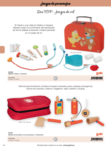 1183 4 013594 510097+3 4 013594 514743+25 x 8,5 x 23 cm24,5 x 15 x 8,5 cmSimplemente solicite en la web: www.goki.euJuegos de personajes51009Malet%u00edn m%u00e9dico, 10 piezascada juego6 juegos | 12 juegos51474Malet%u00edn de bombero con accesorios, 7 elementoscada juego6 juegos | 12 juegosDos TOP- Juegos de rolEl miedo a una visita al m%u00e9dico ni siquiera deber%u00eda surgir. Es sumamente %u00fatil representar de forma realista la situaci%u00f3n m%u00e9dico-paciente en un juego de rol.Este kit para bomberos contiene el equipo necesario para cualquier emergencia: hacha de incendios, linterna, meg%u00e1fono, radio, extintor y br%u00fajula.