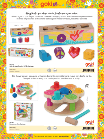 114 013594 5830914 013594 5831071+1+24 x 7 x 7 cm%u00ef 7 cm %u00f018 cmSimplemente solicite en la web: www.goki.eu58309Caja de clasifi caci%u00f3n LOVE, 4 piezas58310Banco martillo, 6 piezascada pieza6 piezas | 12 piezascada pieza0 piezas | 24 piezasDel %u00abflower power%u00bb se pas%u00f3 a un banco de martillo completamente nuevo con dise%u00f1o de flor.Tres palos de madera y una pelota pueden martillearse a tu antojo. Hay tanto que descubrir, tanto que aprender. %u00abPero hagas lo que hagas, hazlo con diversi%u00f3n, energ%u00eda y amor%u00bb. Ese fue nuestro pensamiento cuando empezamos a desarrollar esta caja de madera maciza, robusta y colorida.
