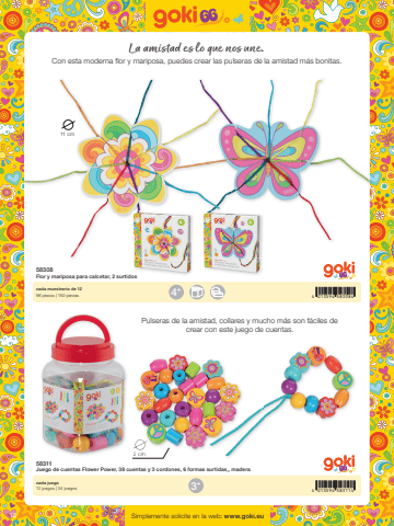 124 013594 5830844 013594 5831144+3+11 cm2 cmSimplemente solicite en la web: www.goki.eu58308Flor y mariposa para calcetar, 2 surtidos58311Juego de cuentas Flower Power, 38 cuentas y 3 cordones, 6 formas surtidas,, maderacada muestrario de 1296 piezas | 192 piezascada juego12 juegos | 24 juegosLa amistad es lo que nos une.Con esta moderna flor y mariposa, puedes crear las pulseras de la amistad m%u00e1s bonitas.Pulseras de la amistad, collares y mucho m%u00e1s son f%u00e1ciles de crear con este juego de cuentas.