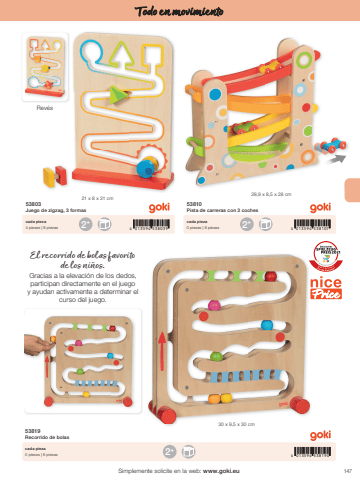 1472 4 013594 538190+2+ 2+4 013594 538039 4 013594 53810728,9 x 8,5 x 28 cm 21 x 8 x 31 cm30 x 9,5 x 30 cmSimplemente solicite en la web: www.goki.euTodo en movimiento53819Recorrido de bolascada pieza0 piezas | 6 piezas53803Juego de zigzag, 3 formas53810Pista de carreras con 3 cochescada pieza4 piezas | 8 piezascada pieza0 piezas | 6 piezasRev%u00e9sEl recorrido de bolas favorito de los ni%u00f1os.Gracias a la elevaci%u00f3n de los dedos, participan directamente en el juego y ayudan activamente a determinar el curso del juego.