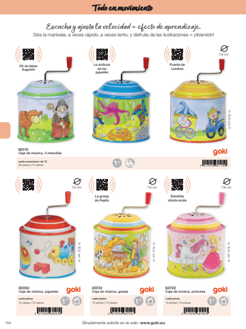 1544 013594 600538 4 013594 607247 4 013594 6072231+ 1+ 1+1 4 013594 601108+%u00ef 10,5 cm %u00f0%u00ef 10,5 cm %u00f0%u00ef 10,5 cm %u00f07,8 cm 7,8 cm 7,8 cm%u00ef 10,5 cm %u00f010,5 cm 10,5 cm %u00ef 10,5 cm %u00f07,8 cmSimplemente solicite en la web: www.goki.euTodo en movimiento60053Caja de m%u00fasica, juguetes60724Caja de m%u00fasica, granja60722Caja de m%u00fasica, princesacada pieza12 piezas | 72 piezascada pieza12 piezas | 72 piezascada pieza12 piezas | 72 piezas60110Caja de m%u00fasica, 3 melod%u00edascada muestrario de 1236 piezas | 72 piezasOh du lieberAugustinLa sinfonia de los juguetesLa granja de PepitoPuente de LondresEstrellita d%u00f3nde est%u00e1sEscucha y ajusta la velocidad = efecto de aprendizaje.Gira la manivela, a veces r%u00e1pido, a veces lento, y disfruta de las ilustraciones = %u00a1diversi%u00f3n!
