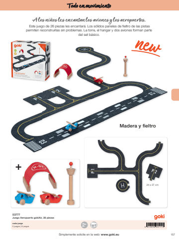 1572 4 013594 537773+24 x 27 cmSimplemente solicite en la web: www.goki.euTodo en movimiento53777Juego Aeropuerto gokiAir, 26 piezascada juego0 juegos | 6 juegosA los ni%u00f1os les encantan los aviones y los aeropuertos. Este juego de 26 piezas les encantar%u00e1. Los s%u00f3lidos paneles de fieltro de las pistas permiten reconstruirlas sin problemas. La torre, el hangar y dos aviones forman parte del set b%u00e1sico.+Madera y fi eltro