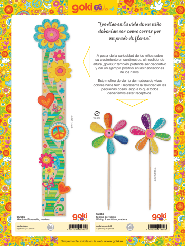 154 013594 606554 4 013594 63858616 cm%u00ef 37,2 cm %u00f0%u00ef 93 cm %u00f0Simplemente solicite en la web: www.goki.eu60655Medidor Floranella, madera63858Molino de viento Whirly, 2 surtidos, maderacada pieza6 piezas | 12 piezascada juego de 60 piezas | 36 piezas%u201cLos d%u00edas en la vida de un ni%u00f1o deber%u00edan ser como correr por un prado de flores.%u201cEste molino de viento de madera de vivos colores hace feliz. Representa la felicidad en las peque%u00f1as cosas, algo a lo que todos deber%u00edamos estar receptivos.A pesar de la curiosidad de los ni%u00f1os sobre su crecimiento en cent%u00edmetros, el medidor de altura %u201egoki66%u201c tambi%u00e9n pretende ser decorativo y dar un ejemplo positivo en las habitaciones de los ni%u00f1os.
