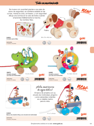 1811+ 1+4 013594 599757 4 013594 5486254 013594 5485404 013594 5484961+1+14 x 8 x 12 cm 14 x 6,8 x 12,5 cm26 x 7,5 x 18,5 cm17 x 7 x 19 cmSimplemente solicite en la web: www.goki.euTodo en movimiento59975Arrastre drag%u00f3n con lazo de motricidad54862Arrastre caracol con lazo de motricidadcada pieza0 piezas | 24 piezascada pieza0 piezas | 24 piezas54854Arrastre perro Max54849Barco de arrastre Ahoy con circuito de motricidadcada pieza12 piezas | 24 piezascada pieza18 piezas | 36 piezasFieltro%u00a1Hola, marineros de agua dulce! El barco de arrastre con su circuito de motricidad, ping%u00fcino y aros salvavidas rodantes es un deleite marino para la vista.Se mueve con suavidad gracias a sus ejes de acero de seguridad, se mantiene estable en las curvas, menea la cola y el trasero, y con seguridad dibuja una sonrisa en la cara de todos cuando emprende infaliblemente la marcha. Su nombre: Max.