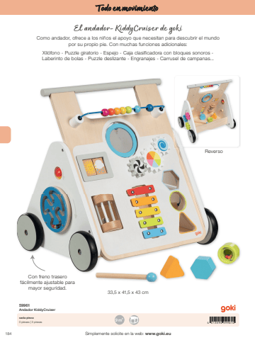 1844 013594 59961033,5 x 41,5 x 43 cm9m+Simplemente solicite en la web: www.goki.euTodo en movimiento59961Andador KiddyCruisercada pieza0 piezas | 3 piezasE l andador- KiddyCruiser de gokiComo andador, ofrece a los ni%u00f1os el apoyo que necesitan para descubrir el mundo por su propio pie. Con muchas funciones adicionales:Xil%u00f3fono - Puzzle giratorio - Espejo - Caja clasificadora con bloques sonoros - Laberinto de bolas - Puzzle deslizante - Engranajes - Carrusel de campanas...Con freno trasero f%u00e1cilmente ajustable para mayor seguridad.Reverso