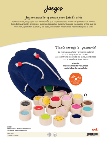 3 4 013594 590044+4 cm59004Memo t%u00e1ctil, 16 texturas diferentes, 32 piezas, bolsa de algod%u00f3ncada pieza10 piezas | 20 piezasToca la superfi cie - %u00a1recuerda!La misma superficie y el mismo material en la bolsa y el par es perfecto. As%u00ed se entrena el sentido del tacto, combinado con la alegr%u00eda de jugar juntos.Material: Madera maciza y diversos materiales de superficie.Jugar conecta- y educa para toda la vidaPara los ni%u00f1os, los juegos son mucho m%u00e1s que un pasatiempo. Abren las puertas a un mundo lleno de imaginaci%u00f3n, emoci%u00f3n y experiencias reales. Jugar juntos crea momentos en los que los ni%u00f1os r%u00eden, aprenden, sue%u00f1an y, de paso, desarrollan importantes habilidades para la vida. Juegos