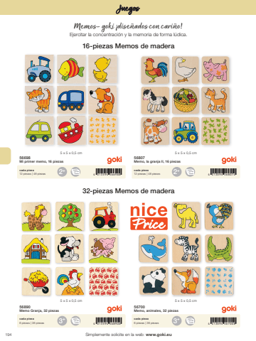 1942+3+2+3+4 013594 5669884 013594 5689064 013594 5680744 013594 5670085 x 5 x 0,5 cm5 x 5 x 0,5 cm5 x 5 x 0,5 cm5 x 5 x 0,5 cmSimplemente solicite en la web: www.goki.euJuegos56698Mi primer memo, 16 piezas56890Memo Granja, 32 piezas56807Memo, la granja II, 16 piezas56700Memo, animales, 32 piezascada pieza12 piezas | 48 piezascada pieza6 piezas | 36 piezascada pieza12 piezas | 48 piezascada pieza6 piezas | 36 piezasMemos- goki %u00a1dise%u00f1ados con cari%u00f1o! Ejercitar la concentraci%u00f3n y la memoria de forma l%u00fadica.16-piezas Memos de madera 32-piezas Memos de madera