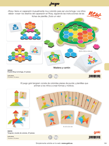 1994 013594 5630244 013594 5631614+3+6 x 6 x 0,4 cm23,9 x 22,3 x 0,8 cmSimplemente solicite en la web: www.goki.euJuegos56302Puzzle Rosy la tortuga, 41 piezas56316Tangram, mundo de colores, 37 piezascada pieza20 piezas | 40 piezascada pieza16 piezas | 32 piezas %u00abRosy%u00bb tiene un caparaz%u00f3n inusualmente muy colorido para ser una tortuga. Los ni%u00f1os deben %u00abcrear%u00bb los dise%u00f1os del caparaz%u00f3n en Rosy, siguiendo las instrucciones de las fichas de plantilla. %u00a1Todo un reto! El juego goki tangram consta de coloridas piezas de puzzle y plantillas que animan a los ni%u00f1os a crear formas y motivos.Madera y cart%u00f3n