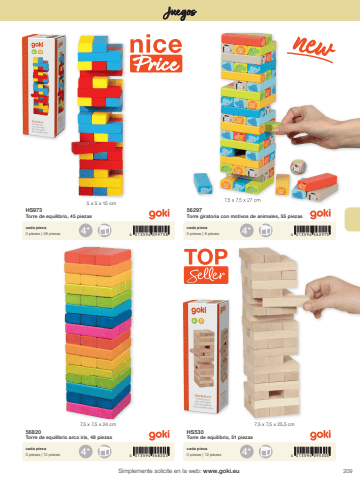 2094+4+4+4+4 013594 5682034 013594 0997384 013594 0953034 013594 5629735 x 5 x 15 cm 7,5 x 7,5 x 27 cm7,5 x 7,5 x 24 cm 7,5 x 7,5 x 25,5 cmSimplemente solicite en la web: www.goki.euJuegos56820Torre de equilibrio arco iris, 48 piezasHS973Torre de equilibrio, 45 piezasHS530Torre de equilibrio, 51 piezas56297Torre giratoria con motivos de animales, 55 piezascada pieza0 piezas | 12 piezascada pieza0 piezas | 48 piezascada pieza0 piezas | 12 piezascada pieza0 piezas | 8 piezas