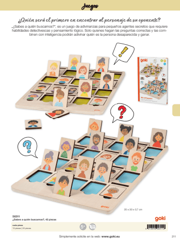 2115 4 013594 563116+20 x 30 x 0,7 cmSimplemente solicite en la web: www.goki.euJuegos56311%u00bfSabes a qui%u00e9n buscamos?, 42 piezascada pieza10 piezas | 20 piezas%u00bfQui%u00e9n ser%u00e1 el primero en encontrar al personaje de su oponente?%u201e%u00bfSabes a qui%u00e9n buscamos?%u201c, es un juego de adivinanzas para peque%u00f1os agentes secretos que requiere habilidades detectivescas y pensamiento l%u00f3gico. Solo quienes hagan las preguntas correctas y las combinen con inteligencia podr%u00e1n adivinar qui%u00e9n es la persona desaparecida y ganar.