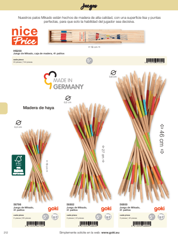 2125 4 013594 092005+%u00ef 18 cm %u00f04 013594 567985 4 013594 568029 4 013594 5680055+ 5+ 5+0,3 cm0,5 cm0,6 cm%u00ef 18 cm %u00f0%u00ef 27 cm %u00f0%u00ef 46 cm %u00f0Simplemente solicite en la web: www.goki.euJuegosHS200Juego de Mikado, caja de madera, 41 palitoscada pieza24 piezas | 144 piezas56798Juego de Mikado, 31 palitos56802Juego de Mikado, 31 palitos56800Juego de Mikado, 31 palitoscada pieza0 piezas | 65 piezascada pieza0 piezas | 43 piezascada pieza0 piezas | 42 piezasNuestros palos Mikado est%u00e1n hechos de madera de alta calidad, con una superficie lisa y puntas perfectas, para que solo la habilidad del jugador sea decisiva. Madera de haya
