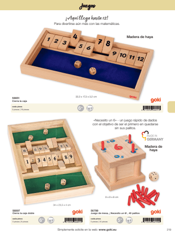 2196+ 5+4 013594 568975 4 013594 5679926 4 013594 566513+32,2 x 17,3 x 3,2 cm34 x 23,5 x 4 cm9 x 9 x 8 cmSimplemente solicite en la web: www.goki.euJuegos56897Cierra la caja doble56799Juego de mesa, %u00a1 Necesito un 6! , 40 palitoscada pieza0 piezas | 8 piezascada pieza0 piezas | 24 piezas56651Cierra la cajacada pieza0 piezas | 16 piezas%u00a1Aqu%u00ed llega hasta 12!Para divertirse a%u00fan m%u00e1s con las matem%u00e1ticas.Madera de haya%u00abNecesito un 6%u00bb - un juego r%u00e1pido de dados con el objetivo de ser el primero en quedarse sin sus palitos. Madera de haya