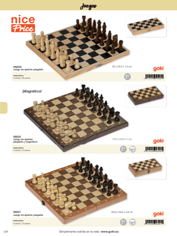 2244 013594 0904074 013594 5692004 013594 5692177+7+7+7+27,6 x 27,6 x 2 cm26 x 25,5 x 1,5 cm29,9 x 29,9 x 4,8 cm7+27,6 x 27,6 x 2Simplemente solicite en la web: www.goki.euJuegosHS040Juego de ajedrez plegable56920Juego de ajedrez plegable y magn%u00e9tico56921Juego de ajedrez plegablecada pieza0 piezas | 36 piezascada pieza0 piezas | 12 piezascada pieza0 piezas | 12 piezas%u00a1Magn%u00e9tico!