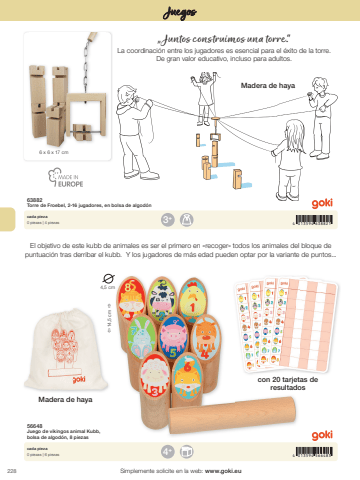 2284 013594 6388214 013594 5664833+4+6 x 6 x 17 cm4,5 cm%u00ef 14,5 cm %u00f0Simplemente solicite en la web: www.goki.euJuegos63882Torre de Froebel, 2-16 jugadores, en bolsa de algod%u00f3n56648Juego de vikingos animal Kubb, bolsa de algod%u00f3n, 8 piezascada pieza0 piezas | 4 piezascada pieza0 piezas | 6 piezas%u201eJuntos construimos una torre.%u201cLa coordinaci%u00f3n entre los jugadores es esencial para el %u00e9xito de la torre. De gran valor educativo, incluso para adultos.Madera de hayacon 20 tarjetas de resultadosMadera de hayaEl objetivo de este kubb de animales es ser el primero en %u00abrecoger%u00bb todos los animales del bloque de puntuaci%u00f3n tras derribar el kubb. Y los jugadores de m%u00e1s edad pueden optar por la variante de puntos...