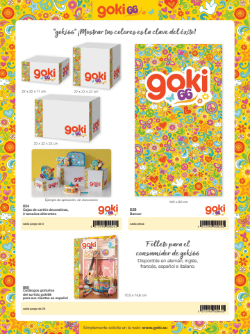 224 013594 008242 4 013594 00828022 x 22 x 11 cm 22 x 22 x 22 cm33 x 22 x 22 cm140 x 80 cm310,5 x 14,8 cmCome molte altre aziende, goki ha sviluppato la propria responsabilit%u00e0 socio-ecologica ispirandosi alla %u201ccultura hippie%u201d.Rivitalizzare il grande obiettivoCreare una cultura della comunit%u00e0 e della solidariet%u00e0 basata sul rispetto reciproco, sulla comprensione e sulla cooperazione.%u201eTutto chi%u00f2 che facciamo,lo facciamo per i bambimi%u201c.Se vuoi saperne di pi%u00f9 su %u201cgoki66%u201d, leggi la storia molto personale del fondatore della nostra azienda. %u00c8 lui che ha avuto l%u2019idea di questa serie...3Come molte altre aziende, goki ha sviluppato la propria responsabilit%u00e0 socio-ecologica ispirandosi alla %u201ccultura hippie%u201d.Rivitalizzare il grande obiettivoCreare una cultura della comunit%u00e0 e della solidariet%u00e0 basata sul rispetto reciproco, sulla comprensione e sulla cooperazione.%u201eTutto chi%u00f2 che facciamo,lo facciamo per i bambimi%u201c.facciamo,Se vuoi saperne di pi%u00f9 su %u201cgoki66%u201d, leggi la storia molto personale del fondatore della nostra azienda. %u00c8 lui che ha avuto l%u2019idea di questa serie...22 x 22 x 22 cm33 x 22 x 22 cmSimplemente solicite en la web: www.goki.eu824Cajas de cart%u00f3n decorativas, 3 tama%u00f1os diferentes828Bannercada juego de 3 cada pieza860Cat%u00e1logos gratuitos del surtido goki66 para sus clientes es espa%u00f1olcada juego de 25%u201cgoki66%u201d %u00a1Mostrar tus colores es la clave del %u00e9xito!Ejemplo de aplicaci%u00f3n, sin decorac%u00edonFolleto para el consumidor de goki66Disponible en alem%u00e1n, ingl%u00e9s, franc%u00e9s, espa%u00f1ol e italiano.4 013594 008600