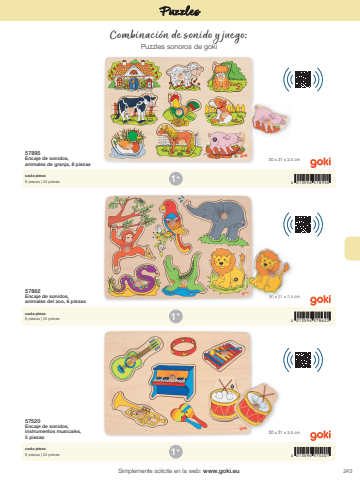 2434 013594 5752014 013594 5786224 013594 5789501+1+1+30 x 21 x 2,4 cm30 x 21 x 2,4 cm30 x 21 x 2,4 cmSimplemente solicite en la web: www.goki.euPuzzlesCombinaci%u00f3n de sonido y juego: Puzzles sonoros de goki57520Encaje de sonidos, instrumentos musicales, 5 piezas57862Encaje de sonidos,animales del zoo, 6 piezas57895Encaje de sonidos, animales de granja, 8 piezascada pieza6 piezas | 24 piezascada pieza6 piezas | 24 piezascada pieza6 piezas | 24 piezas